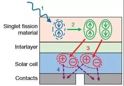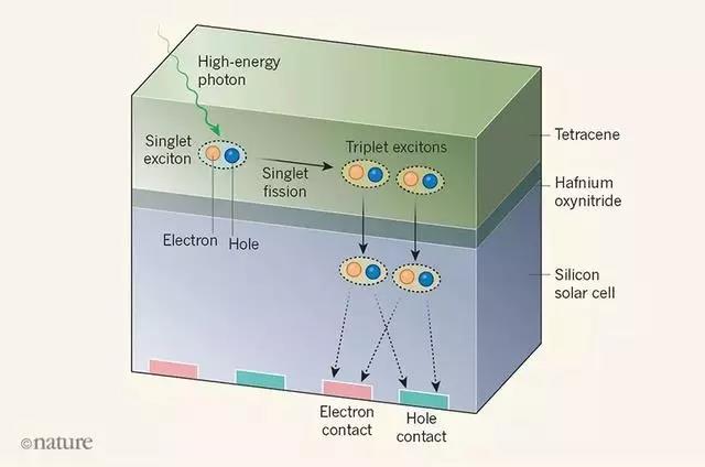 在太陽能電池中,光子激發(fā)材料分子釋放電子,產(chǎn)生電流。通常一個光子只能激發(fā)出一個電子,高能光子的剩余能量會以熱量的形式散失。 此前人們發(fā)現(xiàn),在并四苯等某些有機材料里,一個分子吸收一個高能光子后,可將部分能量轉(zhuǎn)移給另一個分子,最終產(chǎn)生兩個電子,這種現(xiàn)象稱為“單線態(tài)激子裂變”。理論上,在硅電池上覆蓋一層并四苯,就能用一個高能光子獲得兩個電子,但如何讓“單線態(tài)激子裂變”產(chǎn)生的兩個電子轉(zhuǎn)移到硅材料中是一個關(guān)鍵難題。 為了保證電池效率和耐久性,硅材料必須有表面鈍化層。并四苯中產(chǎn)生的電子必須穿過鈍化層,才能到達硅材料。相對于電子轉(zhuǎn)移能力來說,目前的鈍化層都太厚了。 新方案的關(guān)鍵是用氮氧化鉿對硅材料進行鈍化,得到的鈍化層厚度僅0.8納米(1納米等于十億分之一米),可容許更多電子通過。研究表明,并四苯每吸收一個光子,平均有1.3個電子可穿過氮氧化鉿鈍化層,轉(zhuǎn)移到硅材料里。研究人員說,新電池效率遠(yuǎn)未達到理論極限,尚需改進,但試驗證明了其中的關(guān)鍵步驟行之有效。該方案沒有引入復(fù)雜的設(shè)計,而且可能使電池總體上更薄。 |