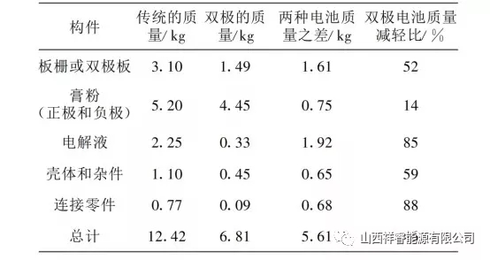目前,除了動(dòng)力鋰電池外,我國(guó)動(dòng)力蓄電池的需求量增長(zhǎng)也很明朗。隨著電動(dòng)汽車的發(fā)展,與其配套的鉛酸蓄電池也得到了相應(yīng)的發(fā)展。蓄電池的使用壽命是制約著電動(dòng)汽車發(fā)展的重要因素之一,所以,提高鉛蓄電池的使用壽命至關(guān)重要。影響鉛酸蓄電池使用壽命的因素主要包括,與之相配套的充電器、自身質(zhì)量、用戶使用方式是否正確等。 提高蓄電池質(zhì)量,可以從鉛膏及固化入手,鉛膏添加劑是從事鉛酸電池研究的人員長(zhǎng)期研究的內(nèi)容之一,鉛膏主要作用是改善正極的導(dǎo)電性能,增加正極的孔率,改善負(fù)極充電接受能力和防止極板的硫鹽化。多數(shù)充電器在指示燈變燈指示充滿電以后,電池充入電量可能是97%~99%。雖然僅欠充電1%~3%的電量,對(duì)續(xù)行能力的影響幾乎可以忽略,但是也會(huì)形成欠充電積,所以電池充滿電變燈以后還是盡可能繼續(xù)進(jìn)行浮充電,這樣對(duì)抑制電池硫化也是有好處的。 目前,除了動(dòng)力鋰電池外,我國(guó)動(dòng)力蓄電池的需求量增長(zhǎng)也很明朗。電動(dòng)汽車所用的動(dòng)力鉛酸蓄電池種類多樣化,包括雙極性鉛酸蓄電池、水平鉛酸蓄電池,以及卷式電池等。雙極性密封鉛酸蓄電池最早是由美國(guó)Arias公司開發(fā)的,是一面有正極活性物質(zhì),另一面有負(fù)極活性物質(zhì)的堅(jiān)實(shí)薄片極板的電池,具有較高的比能量。 普通鉛酸電池的極板是豎立著放置的,而雙極性鉛酸蓄電池的電極是平臥著放置的。電極水平臥著放置是為了防止電解液層化,和活性物質(zhì)剝離,以及便于采用輕量薄形電極基片。通過采用雙極性結(jié)構(gòu),大大減輕了鉛酸電池的質(zhì)量,提高了設(shè)計(jì)效率。如表1,是對(duì)傳統(tǒng)的12V12Ah鉛酸電池與雙極性24V12Ah鉛酸電池零件分解質(zhì)量的比較。