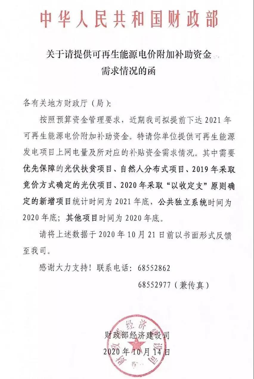 財政部下發(fā)了《關于請?zhí)峁┛稍偕茉措妰r附加補助資金需求情況的函》,擬提前下發(fā)2021年可再生能源電價附加補助資金。 通知明確表示,將優(yōu)先保障光伏扶貧項目、自然人分布式項目、2019年競價光伏項目、2020年“以收定支”新增項目。補貼時間截止為2021年底,公共獨立系統(tǒng)和其他項目的補貼截止時間為2020年底。 統(tǒng)計申報截止時間為2020年10月21日。