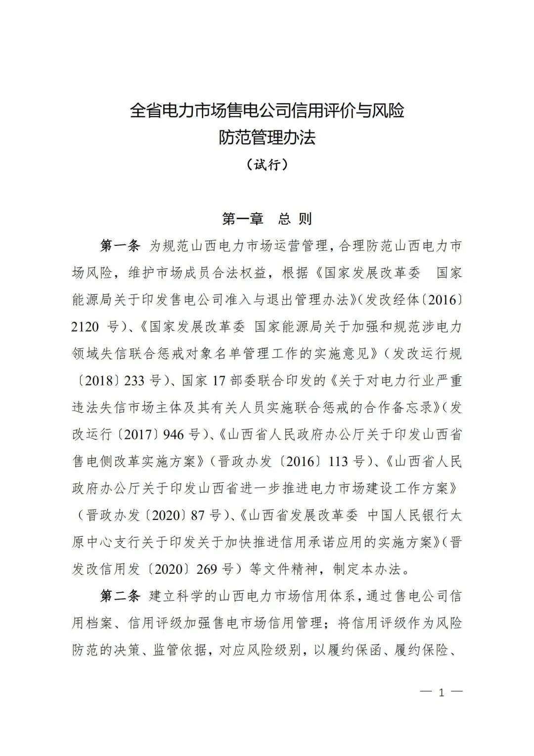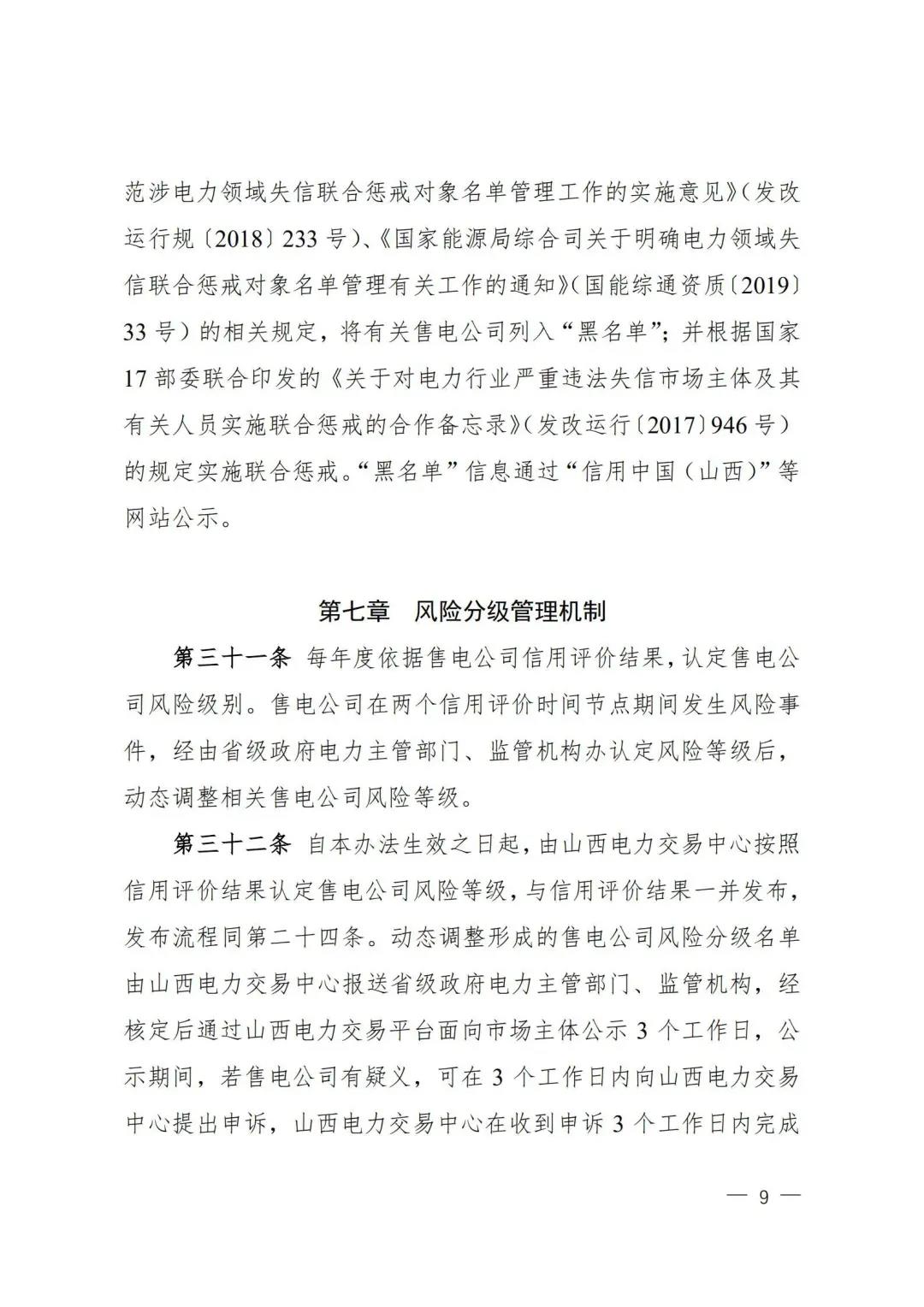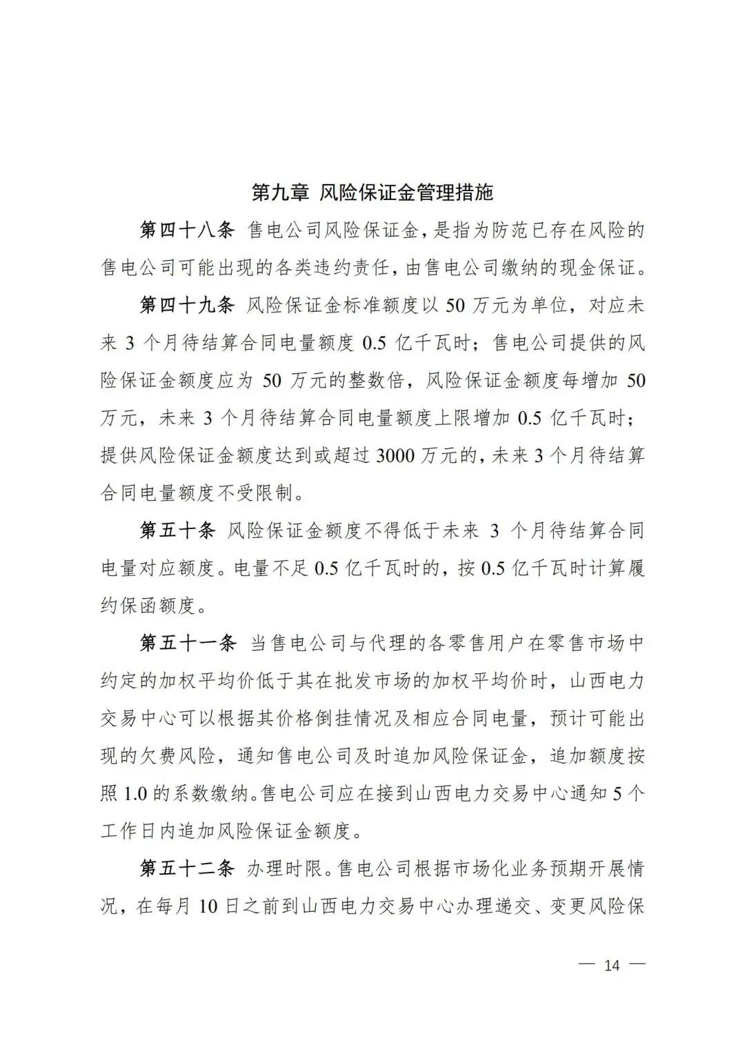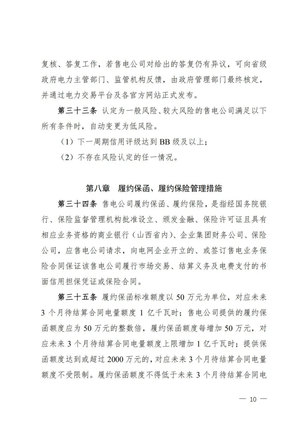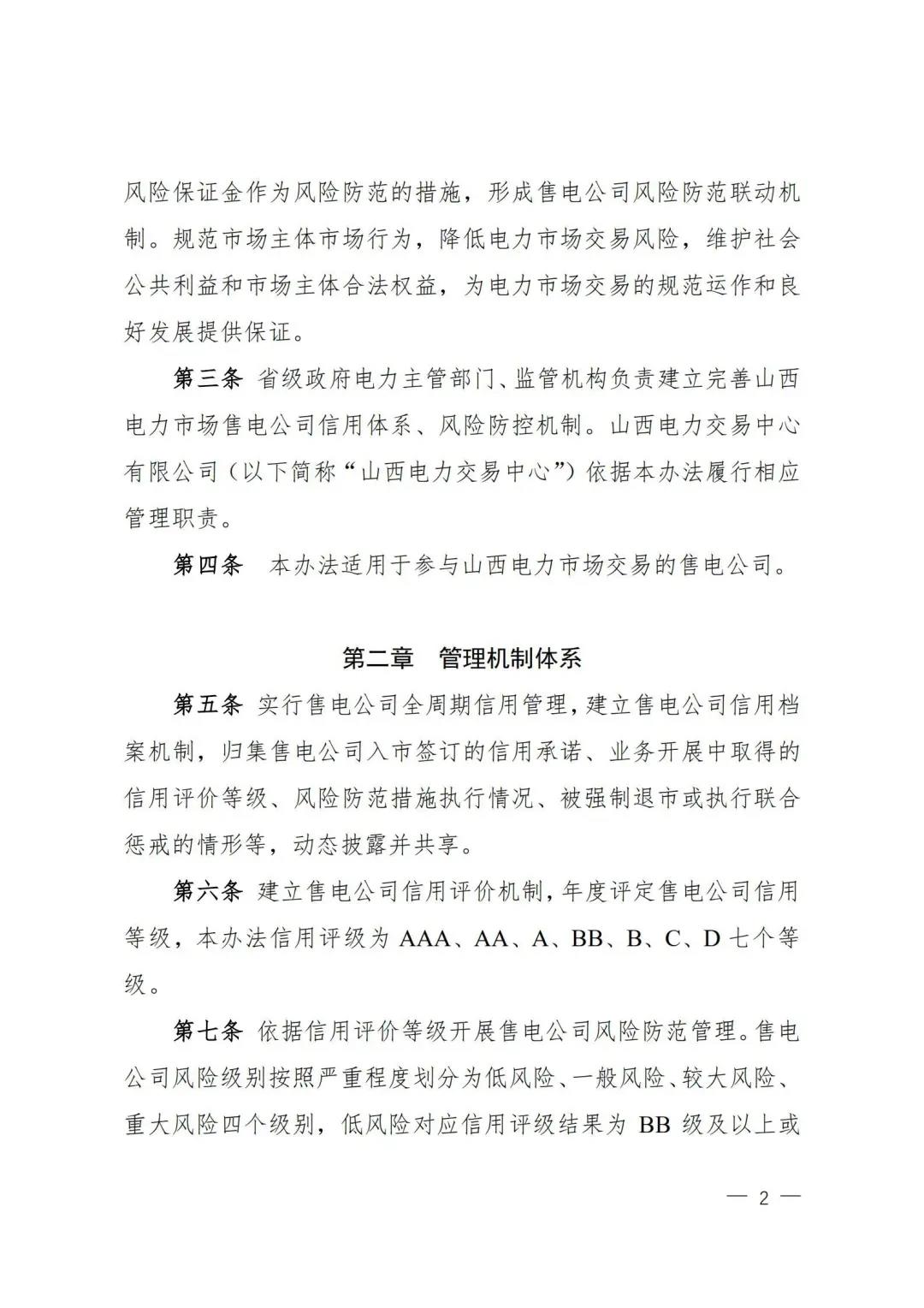 | 山西電力市場售電公司信用評價與風險防范管理辦法:依據(jù)風險級別執(zhí)行履約保函、保險或風險保證金措施 |